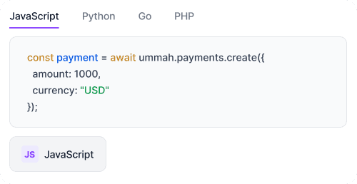 Most teams go live within a few days. Ummah provides a RESTful API, SDKs for JavaScript, Python, Go, and PHP, a sandbox testing environment, and complete API reference documentation. No lengthy onboarding process or custom development required.