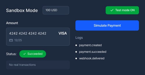 Sign up for a free account to access the sandbox environment and API documentation. Test your integration, then go live when ready. No contracts or commitments required on the Standard plan. For Custom plans, contact sales for a tailored onboarding.